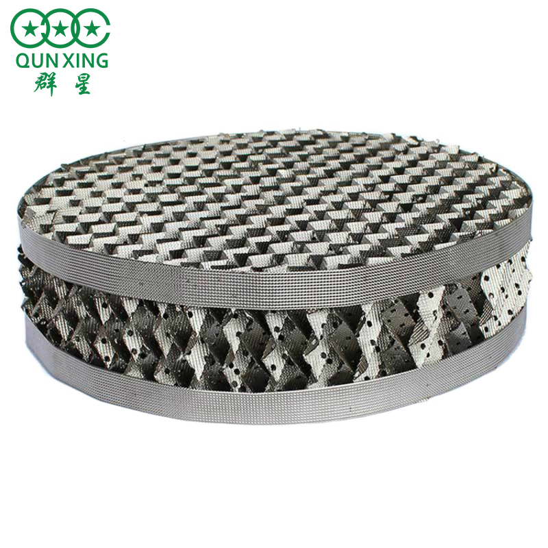 金屬填料適用于真空精餾塔,處理G敏性、易分解、易緊合、易結(jié)碳的物料,金屬填料廣泛用于石化、化肥、化工、H保等行業(yè)的填料塔中。金屬填料分為金屬散堆填料(鮑爾環(huán)、矩鞍環(huán)、階梯環(huán)、共軛環(huán)、八四內(nèi)弧環(huán)、扁環(huán)等)和金屬規(guī)整填料(金屬絲網(wǎng)波紋填料、金屬孔板波紋填料、壓延刺孔板波紋填料、金屬網(wǎng)板波紋填料、HT 半管式規(guī)整填料)。金屬填料的優(yōu)缺點都非常明顯,其優(yōu)點在于其可以加工成各種幾何形狀結(jié)構(gòu)的填料、良好的潤濕性、耐高溫性、壓降小、金屬填料裝塔時不會破碎、便于裝卸和清理;由于其強度高,彈性模量大,因而可以使填料的壁厚加工的很薄:若制備成波紋填料,其板的厚度一般在01~15mm;而若制備成絲網(wǎng)波紋填料,國外不銹鋼絲直徑一般為016mm左右,國內(nèi)絲網(wǎng)規(guī)格不一,通常在01到025mm之間。但是金屬填料缺點是制造價格貴、加工成本高,雖說一次性投資稍大,但卻能發(fā)揮塔設(shè)備的潛在力;此外金屬填料成型工藝復(fù)雜、耐各類酸堿溶液的腐蝕性較差、使用壽命較短,一般在兩年左右。金屬填料可用多種不同的金屬材質(zhì)加工制備,一般而言,金屬填料可根據(jù)實際應(yīng)用的需要可選用不銹鋼、碳鋼、C4鎳基合金、蒙乃爾合金、鋁、青銅、鎳、鈦等金屬作為基質(zhì)制備加工填料。對不同材質(zhì)選擇時主要考慮其耐腐蝕性的問題,碳鋼材質(zhì)填料造價低,且具有良好的表面潤濕性能,對于無腐蝕或腐蝕性比較低的物系,一般給與優(yōu)先考慮使用;不銹鋼填料耐腐蝕性較強,一般能夠耐除C1以外常見物系的腐蝕,但其造價成本較高,并且表面潤濕性能相對較差,除了在某些特殊的應(yīng)用場合(如極低噴淋密度下的減壓精餾過程)才考慮使用,使用前通常需要對其表面進行處理,以提高其表面的潤濕性,這樣不銹鋼填料才能取得良好的使用效果;對于鈦材、特種合金鋼等材質(zhì)制成的填料由于造價很高,一般在某些腐蝕性極強的物系下使用,使用范圍很有限。圖12為金屬散堆填料和金屬規(guī)整填料實物圖。